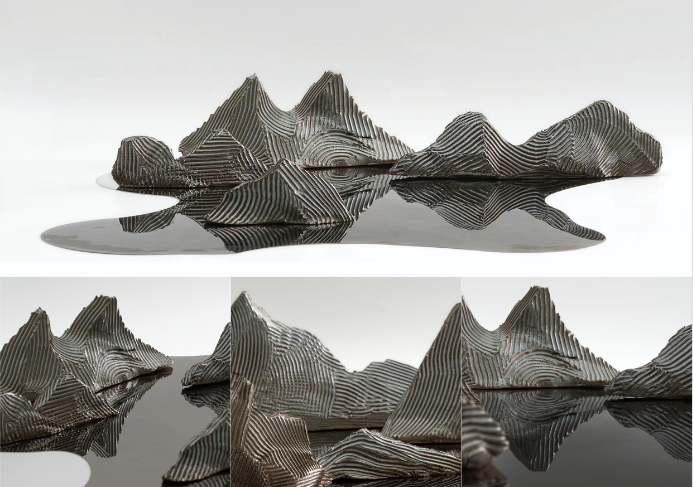 《山止川行》的创作灵感源自中国大地壮阔的自然景观与厚重的文化底蕴,以起伏山峦的沉稳与江河奔涌的灵动为核心意象。在造型表达上,作品以流畅且富有张力的线条勾勒山川轮廓,高低错落的形态层次分明,既还原了自然景观的磅礴气势,又通过艺术化提炼赋予作品强烈的视觉冲击力。