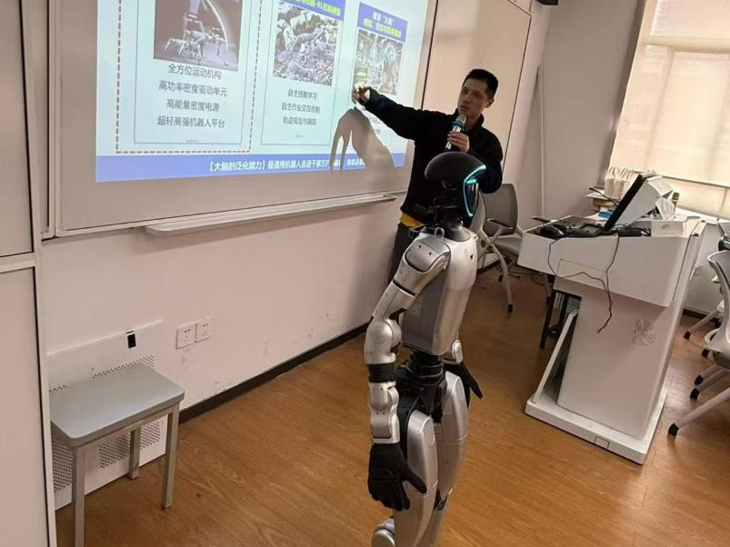 上午杭州宇树科技有限公司的技术专家黄老师率先开讲,他围绕具身机器人的发展历程、技术现状以及当前面临的难点与突破方向,为学员们构建了清晰的知识框架。在理论讲解之后,现场演示了机器人灵活的运动控制能力——从平稳行走、快速后退到精准转圈,乃至高难度的舞蹈动作,机器人在指令下收放自如的精彩表现,赢得了学员们的阵阵掌声。