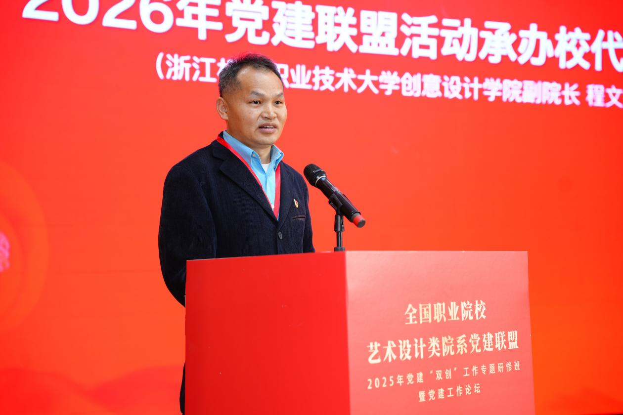副院长程文锋在论坛上做发言,表示浙江机电职业技术大学创意设计学院作为新一届轮值主席单位将在联盟指导下,传承联盟优良传统,紧扣“党建引领艺术设计育人创新”,积极谋划2026年度党建研讨、经验交流、成果展示等活动,推动形成可复制、可推广的党建与业务融合新模式,让党建“软实力”真正转化为专业发展“强引擎”,为培养更多高素质艺术设计人才、增强职业教育服务经济社会发展能力贡献力量。