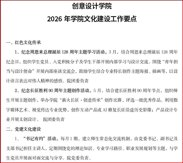 二、聚焦年度目标,逐项落实重点建设任务。学院党委坚持学思用贯通、知信行统一,将学习教育与学院年度重点工作任务部署落实相结合,系统谋划布局年度重点目标任务。院党委牵头制定《2026年党建思政工作要点》、《2026年学院文化建设工作要点》,同步制定工作计划安排表,确保每项重点工作由分管领导牵头组织,具体责任人负责落实。学院制定《2026年工作目标及重要举措》,围绕教育教学、学生工作、科研及社会服务、师资队伍、综合管理五方面目标任务,逐条细化建设举措,着力破解学院发展中的难点、堵点问题,推动学院高质量发展。