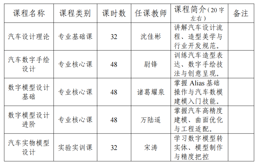 本微专业面向新能源汽车产业数字化发展需求,培养德技并修,具备扎实汽车数字模型设计专业基础,熟练掌握Alias等专业软件操作,能够独立完成汽车外观造型数字建模、数字手绘、实物模型设计与造型优化等工作的高端技能人才。