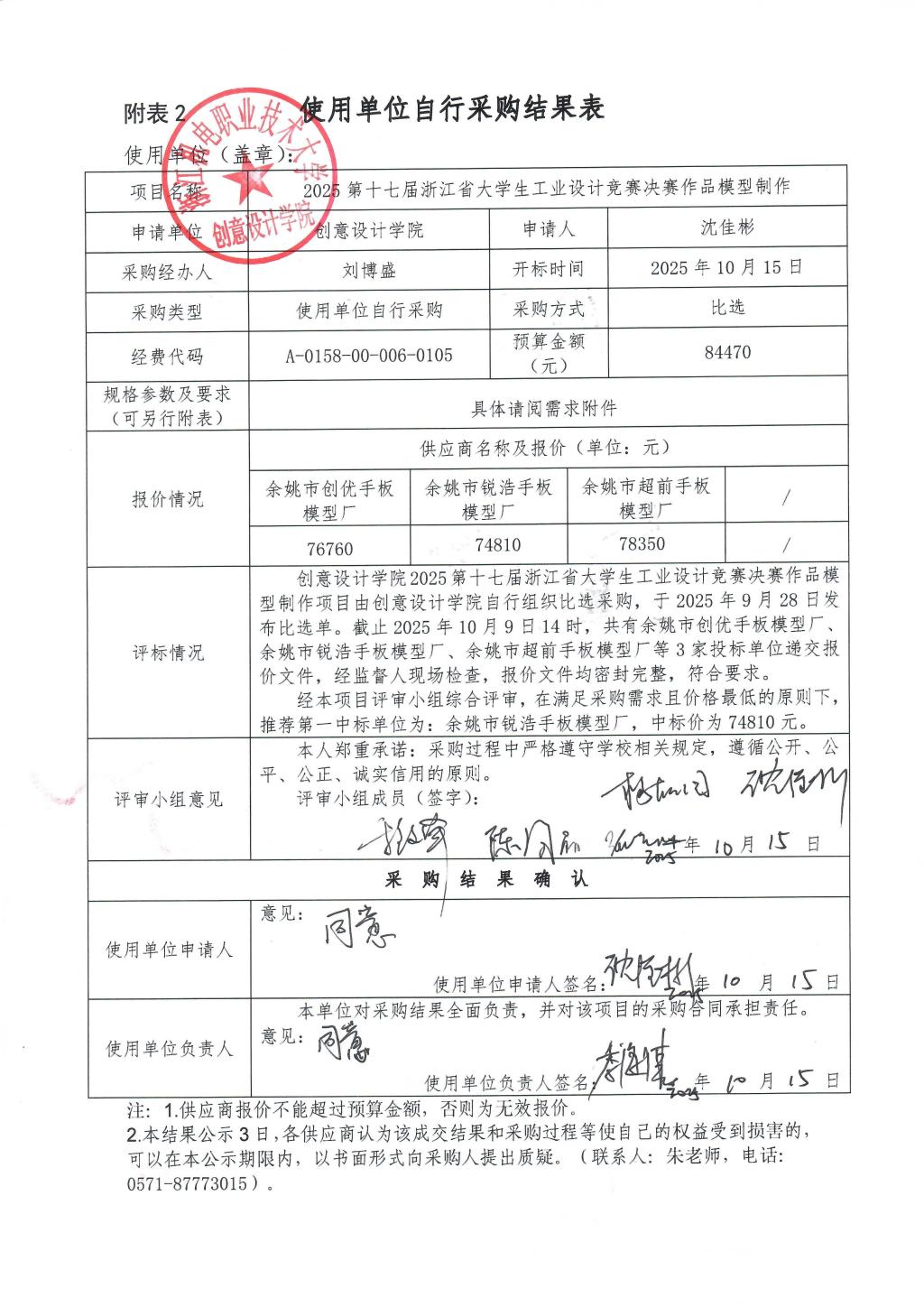 2025第十七届浙江省大学生工业设计竞赛决赛作品模型制作使用单位自行采购结果表